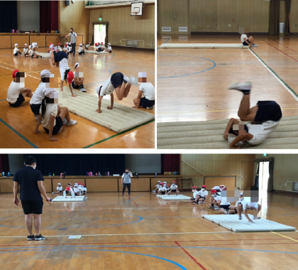 3年生の体育です。マット運動の学習です。ウサギやカエルのまねっこをして腕で体を支える準備運動をしっかりした後、前転の練習をしました。