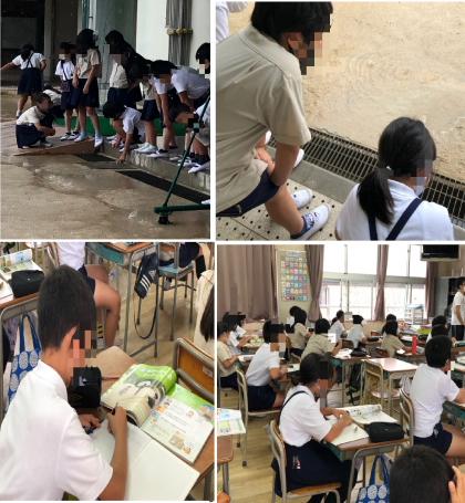 4年生の理科です。地面に落ちた水がどのように流れるのかの学習です。今日は雨が降っているので、運動場に降った雨水がどのように流れているか実際に見た後、教科書をもとにまとめていました。