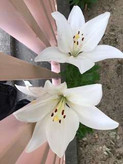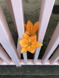 昨日、学校の周りを歩いていて柵の間から顔を出している「てっぽうゆり」を見つけました。白いほうは柵の内側に咲いていました。かわいいですね。