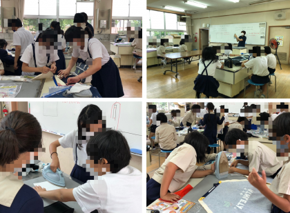 6年生の家庭科です。エプロン製作をしています。折り目をつけるためにアイロンを使っていました。ケガを防ぐため、使う本人も周りも十分注意しています。