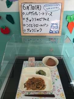 今日の献立は、スパゲッティミートソース、キュウリのピクルス、黒糖ロールパン、牛乳です。いただきます。