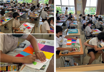 2年生の図工です。画用紙を8等分に区分けしてそれぞれのマスに隣りどおしは違うようにパスで色を塗っていました。きれいに色が出るようしっかり塗り込んでいました。色がしっかり塗れて白いところがなくなったら、この画用紙に綿棒等で絵を描いていくそうです。どんな作品になるのかな、楽しみですね!