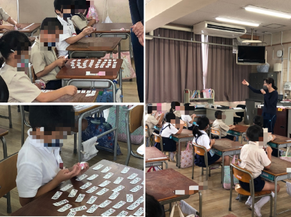 1年生の算数です。計算カードを使ってたし算の学習をしていました。答えが「10」になるたし算のカードを探すため、頭の中で一所懸命計算している様子がよくわかりました。