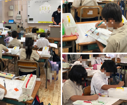 3年生の図工です。「6月の絵」の題材で描きます。下絵をしっかり描いて、色を塗り始めていました。