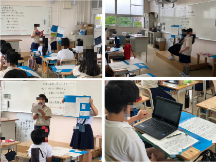 5年生の国語です。ネットなどで調べた「地球温暖化」や「外来生物」についてなど、みんなに伝えたいことをまとめ、発表していました。みんなしっかり伝えることができていました。