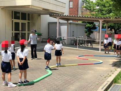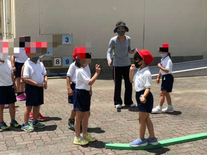 1年生の体育です。体育館前に常置してある低平均台でじゃんけん遊びをしていました。少しでも相手の陣地に近づいてじゃんけんするため、平均台から落ちないよう素早く動こうと一所懸命バランスを保って頑張っていました。