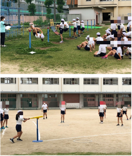 4年生の体育です。鉄棒運動とティーボールを楽しんでいました。