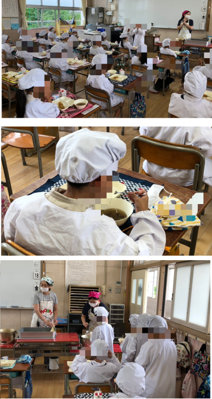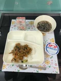 今日の献立は、和風カレー丼、もずくとオクラのとろり汁、ヨーグルト、牛乳です。しっかりといただきましょう。おかわりもします。