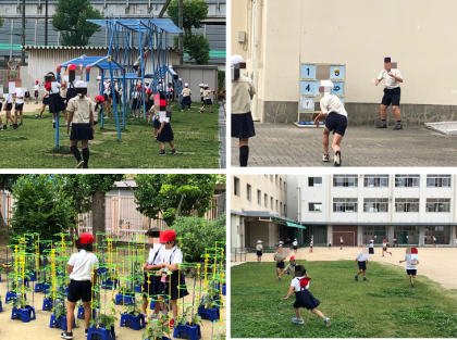休み時間の運動場の様子です。ボール投げをしたり、鬼ごっこをしたり、植物の世話をしたり、それぞれですね。