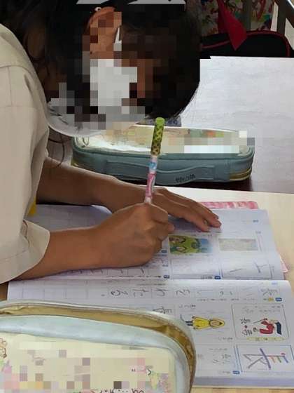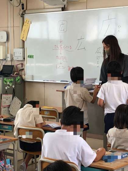 2年生の国語です。漢字の学習です。漢字学習帳を丁寧に書き、先生に見てもらいます。