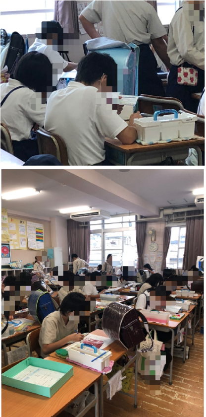 6年生の図工です。ランドセルを写生していました。ほとんどの子が着色に入っていました。もうすぐ完成かな。