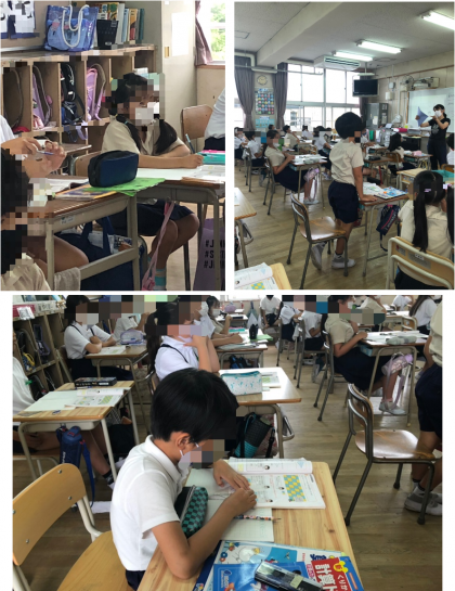 4年生の算数です。ひし形の学習でした。先生が提示している具体物(この時は大きなひし形の折り紙でした)を見ながら自分の考えを発表していました。