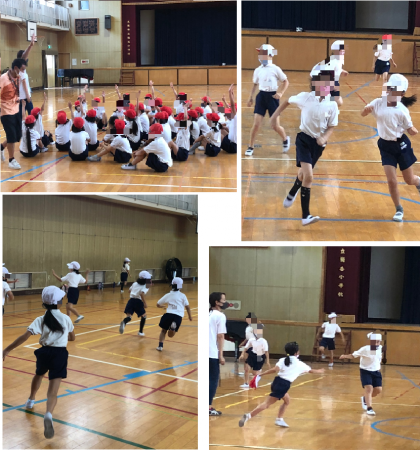 2年生の体育です。天候や気温・水温の関係でプールに入れなかったので、体育館で思い切り走り回りました。