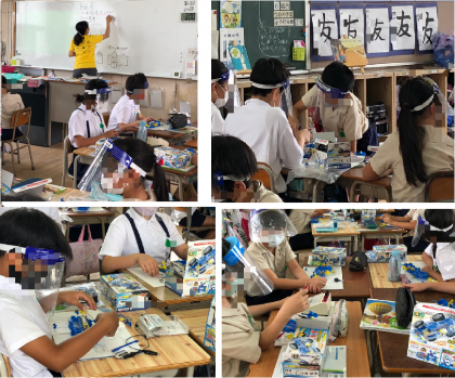 4年生の理科です。電流の実験です。乾電池と電流の大きさについて、班で協力して調べていました。
