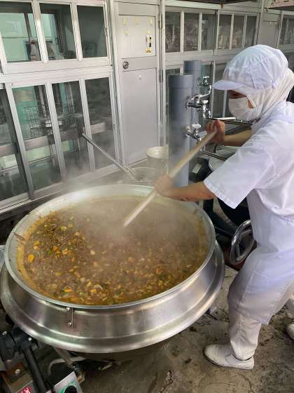 今日の献立は、夏野菜のカレーライス、キャベツのサラダ、冷凍ミカン、牛乳です。カレーは、大鍋でじっくり煮込みますがかき混ぜるのも大変です。こんな鍋をいくつも使って作っています。重労働ですね。調理員さんありがとうございます。