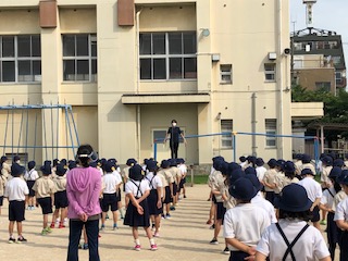 月曜日なので児童朝会があります。学校長から、熱中症に気を付けたマスク着用についてを中心に、自分の健康を常に自分で留意して過ごす意識をもつよう話がありました。