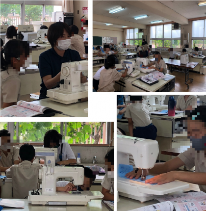 5年生の家庭科です。ミシン縫いの練習です。返し縫いができるよう布の方向の変え方を学習していました。うまくいかない子は、挙手して先生が来るのを待って直接指導をしてもらっていました。