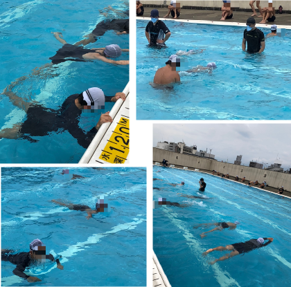 5年生のプール水泳学習です。平泳ぎの練習をしていました。腕の動かし方と足の動かし方を分けて練習した後、実際に泳いでみました。スーッと進む子、なかなかうまくいかない子、それぞれですが、これからもっと練習を積み重ねてうまくなっていきましょう。