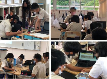 5年生の社会科です。気候について調べたことをタブレットの「発表ノート」にまとめています。まとめた内容を班のみんなで発表しあいました。