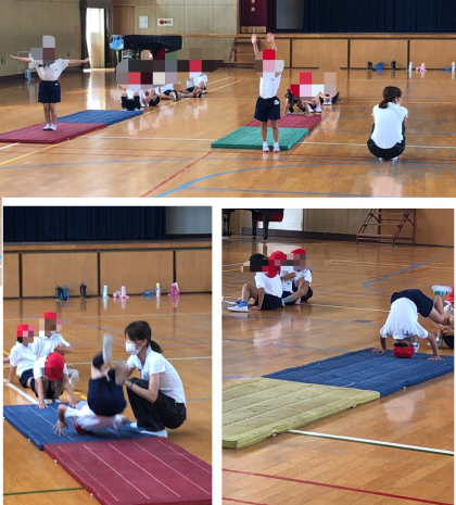 1年生の体育です。マット遊びをしていました。決めポーズがさまになってきました。