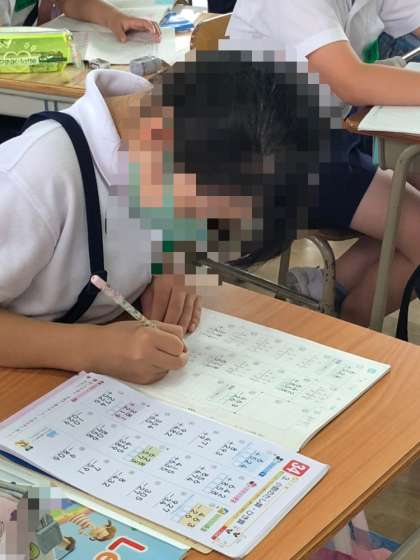 4年生の算数です。計算ドリルをしていました。1学期の分は1学期中に終わらせましょう。