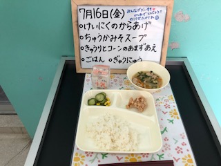 今日の献立は、鶏肉のから揚げ、中華みそスープ、キュウリとコーンの甘酢和え、ごはん、牛乳です。おいしくいただきましょう。