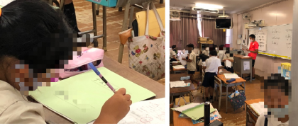 3年生です。テスト返しと答え合わせをしていました。今日は、単元学習は終わっているので1学期の片付けが中心の活動だそうです。