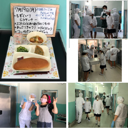 今日は、1学期最後の給食です。献立は、もずく入りヒラヤーチー、豚肉と厚揚げの煮物、あっさりきゅうり、コッペパン、牛乳、イチゴジャムです。調理員さん、栄養教諭さん、ありがとうございました。2学期もよろしくお願いいたします。
