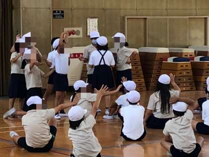 5年生です。自然体験学習の出し物の練習をしていました。実施は2学期ですがいろいろ準備を進めています。