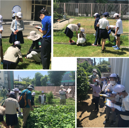 子どもたちは、説明を聞いた後、4班に分かれて校内のいろいろな場所で生き物を探し、記録していきます。