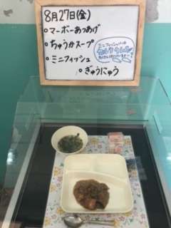 今日の献立は、マーボー厚揚げどんぶり、中華スープ、ミニフィッシュ、牛乳のよていでしたが、自家炊飯器の不調で白飯の提供ができませんでした。代わりにマーボー厚揚げ、中華スープ、ミニフィッシュ、黒糖パン、牛乳という献立になりました。また、給食提供時刻も大幅に遅くなりました。子どもたちに対して大変迷惑をかけてしまいました。大変申し訳なく思います。