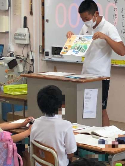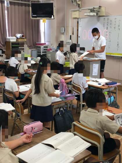 3年生の国語です。夏休み中に書いた作文などを返却していました。中には、きれいに着色した絵日記を描いた子もいて、みんなに紹介されていました。