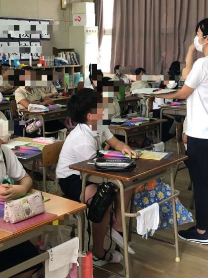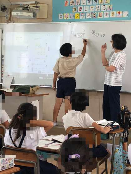 左側が2組の算数、割り算の筆算の学習をしていました。