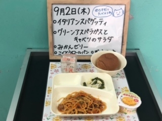 今日の献立は、イタリアンスパゲッティ、グリーンアスパラガスとキャベツのサラダ、ミカンゼリー、黒糖ロールパン、牛乳です。いただきます!