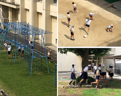 運動場でも、サッカーをしていたり遊具で遊んでいたり、芝生や木々のそばで遊んでいたりと様々でした。