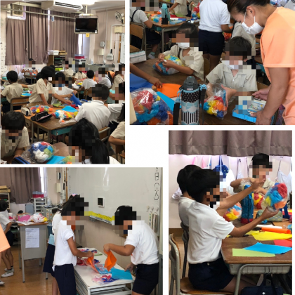 3年生の図工です。ビニール袋に色半紙をつめたカラフルな袋を胴体や頭にして動物をつくる「カラフルフレンド」です。どんなきれいな動物ができるのでしょうね、楽しみですね。