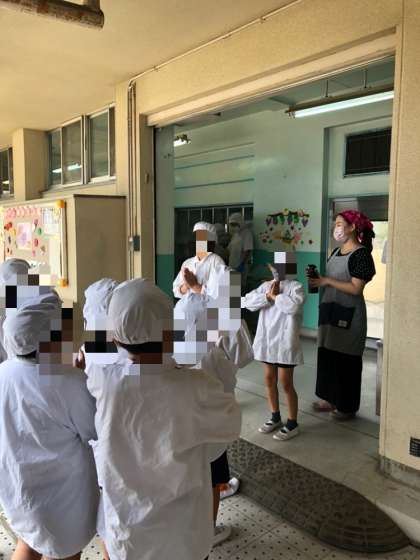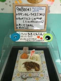 今日の献立は、チキンカレーライス(米粉:ルーに小麦粉ではなく米粉を使っています)、キャベツとコーンのサラダ、冷凍ミカン、牛乳です。今日のカレーには、ラッキーにんじん(ハートマークや星形のにんじん)が入っているそうです。自分のカレーに入っているかな。