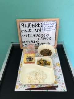 今日の献立は、マーボーナス、ツナとチンゲンサイの炒めもの、煎り黒豆、ごはん、牛乳です。今日もおいしそうですね、いただきます。