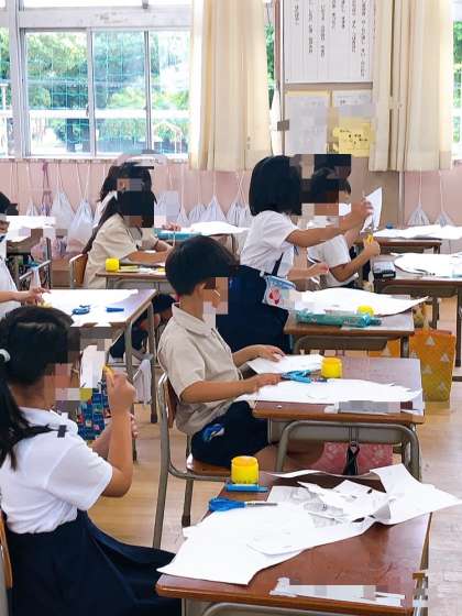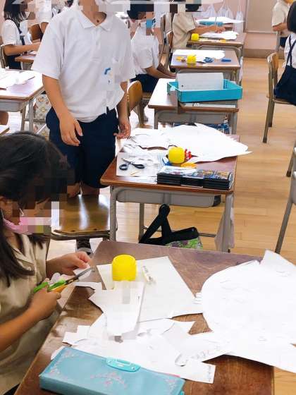 1年生の図工です。素敵な魚がずいぶん形づくられてきました。はさみやのりを駆使して一所懸命つくっていました。