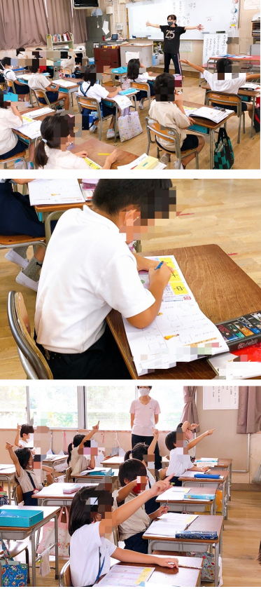 1年生の国語です。漢字の学習でした。「大」の字の成り立ちを体を使って表現していました。書き順をみんなで確認したあと、ドリルに丁寧に練習していました。