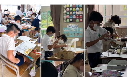 4年生の図工です。ビー玉転がしゲーム「コロコロガーレ」を作っていました。方眼の厚紙やプラスチックトレー、紙コップやトイレットペーパーの芯などいろいろなものを使って楽しそうな迷路になるよう工夫していました。