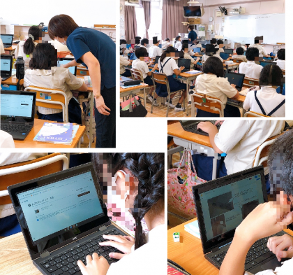 6年生の家庭科です。「快適な住まい」の単元で清掃についての学習をしていました。各班で、校内の汚れている個所を映像付きでまとめたページを作り、そのページ上にコメントを載せる形で意見交流をしていました。すべてタブレット上での活動で、飛沫対策、密対策に有効です。しかしながらそれをするにはタブレットを使いこなす技量が必要なのですが、6年生はそれができるレベルまで習熟しています。