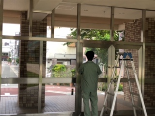 管理作業員さんが、玄関のガラス扉の整備と清掃をしてくれました。大きなガラス戸で、子どもたちが毎日出入りする場所であり、学校の顔と言える場所です。玄関の安全性と美観をしっかり管理してくれてとてもありがたいです。