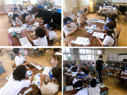 1年生のプログラミング学習の様子です。自分たちが並べた用紙の通りにロボットを動かせるように考えます。うまく動かせたときは、とてもうれしそうに「かわいい!」と声を上げていました。飛沫予防のためフェイスシールドをつけています。