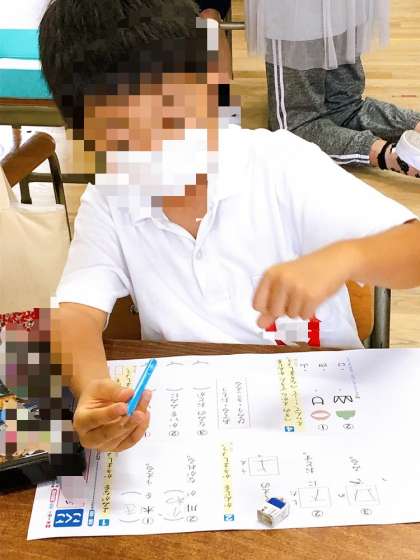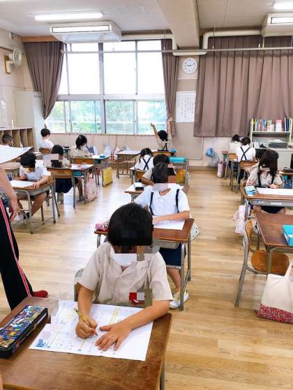 1年生の国語です。漢字のテストをしていました。先生の説明を聞きながら真剣に取り組んでいました、がんばれ!