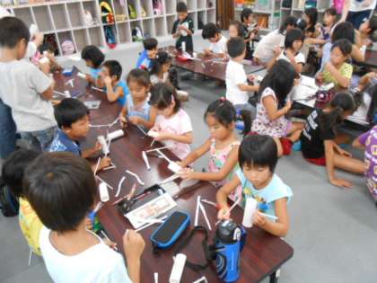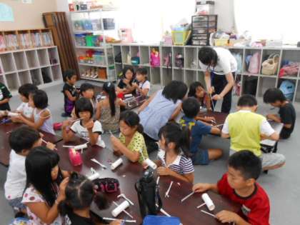 子どもたちが熱心にアーチェリーを作っています。うまく穴にストローが通せずに泣いている子どももいましたが、指導員の先生がやさしく教えてくれます。