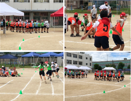 5年生の体育です。リレーの練習でした。テントが立てられトラックもきれいにひかれた本番さながらの運動場で、入場から競技、退場までしっかり練習していました。子どもたちはリハーサルのような気持ちだったのではと想像しながら見ていました。