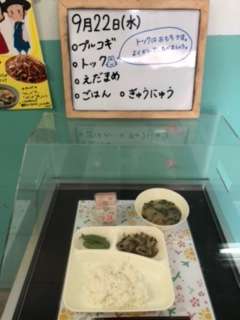 今日の献立は、プルコギ、トック、枝豆、ごはん、牛乳です。トックは韓国・朝鮮のおもちです。よく噛んで食べましょうね。いただきます。