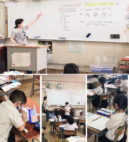1年生の算数です。3つの数をたすたし算を考えていました。考え方を図で表したり、指で表したり、言葉で表したり、自分の考えた方法を発表していました。そして、どのやり方でも答えが一緒になったことを確かめていました。