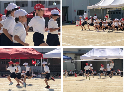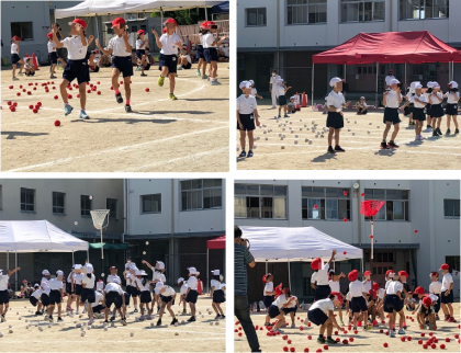 1年生の様子です。個人走はトラック内の直線コースを走りました。団体競技はダンス玉入れです。玉入れの合間にかわいいダンスが入ります。